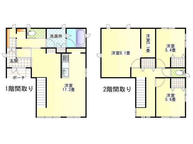 | 詳細間取 | 3LDK (2階:洋8.1帖×1、2階:洋5.4帖×1、2階:洋5.6帖×1、1階:LDK17.3帖) | ||