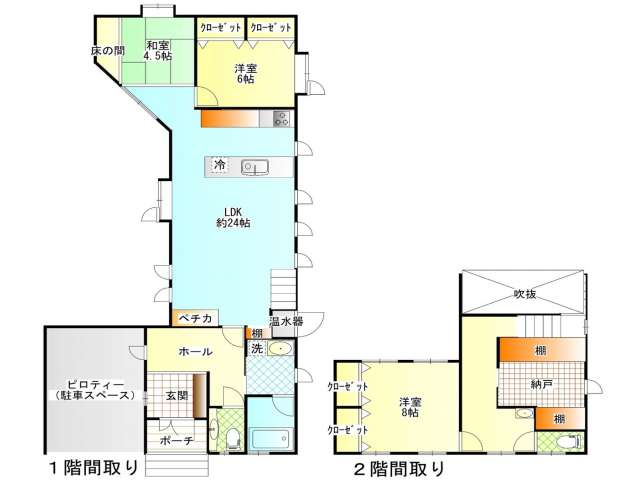 | 詳細間取 | 2LDK (1階:洋6帖×1、2階:洋9帖×1、LDK24帖) | ||